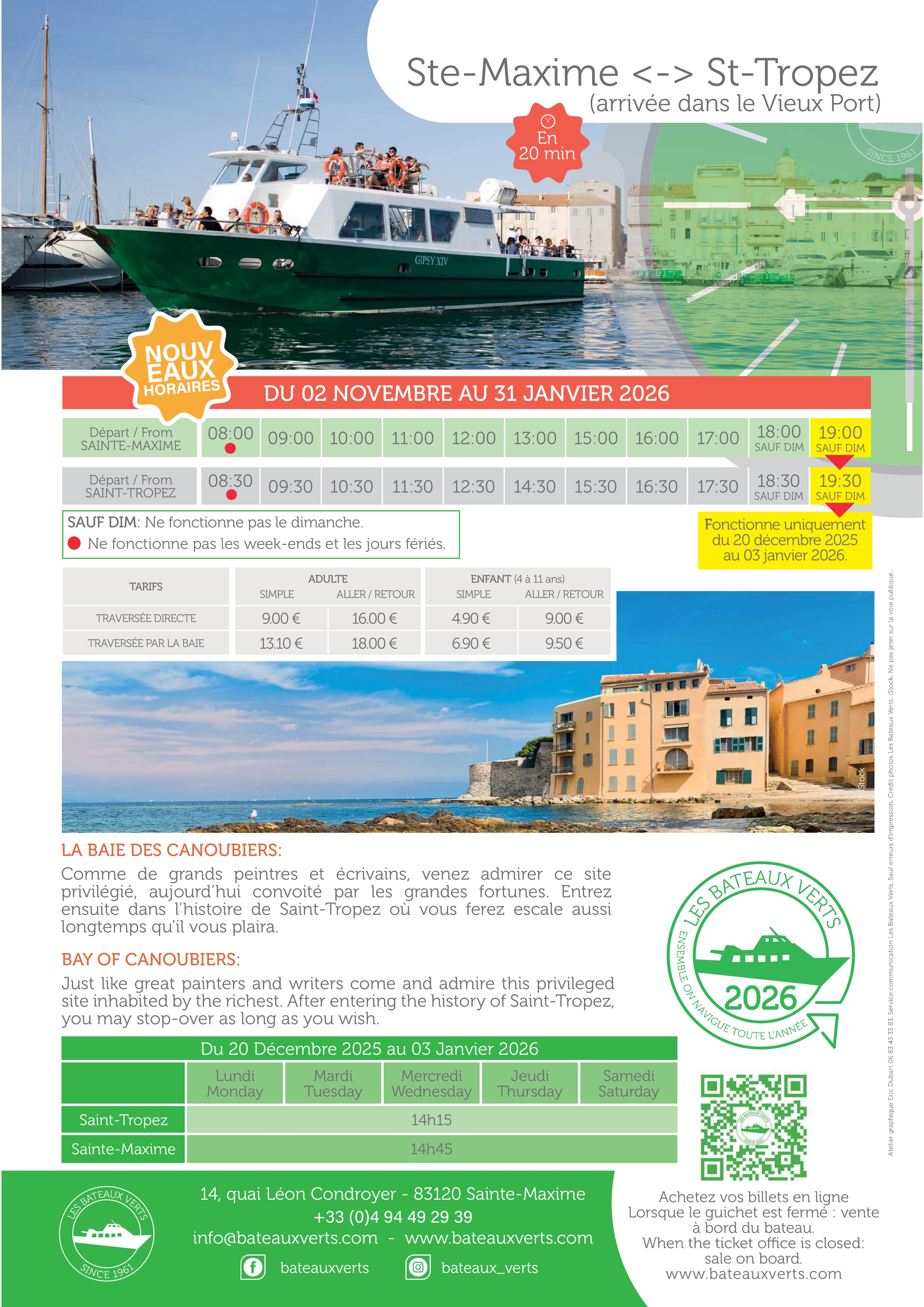 Nos horaires sur la navette Sainte-Maxime / Saint-Tropez évoluent pour la saison hivernale 2025-2026 à compter du 02 Novembre. Bonne nouvelle ! Les Bateaux Verts navigueront sur la ligne Ste-Maxime / St-Tropez aussi en Janvier…